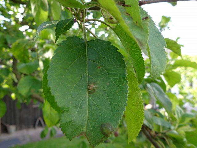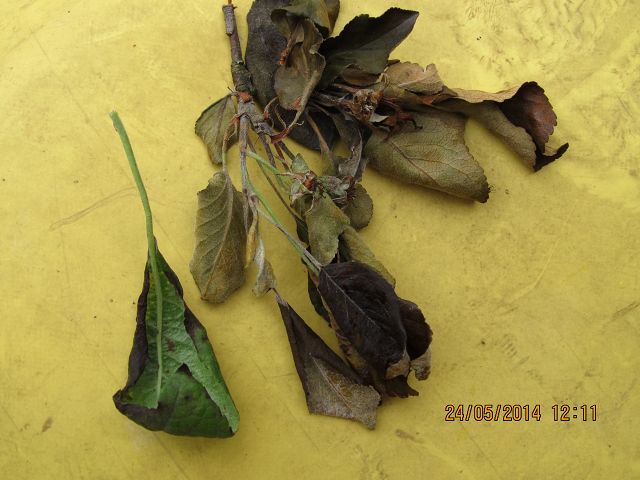 Hezké ráno, s dost velkou pravděpodobností jde o strupovitost jabloně. Začíná to jakoby sazovitými skvrnami, které později udělají postupně zasychající "skvrny", při velkém tlaku infekce silně napadené -prosychající- listy opadávají. |
