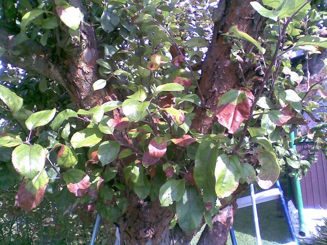 Nebudu-li koukat na ostatní, mohla by to být obecně rezavě zbarvená, poslední dobou se významně množící řasa. Ta stromu neublíží. Podle druhé fotky mi přijde, že kůra na větvích praská, jakoby strom sílil víc než zvládne. Na poškození mrazem před lety to nevypadá, spíše na začátek účinkování korových nekróz. Nezačali ti sršni vykusovat kůru a dřevo? |