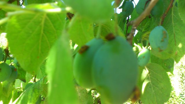 Jestli jsou na fotce nějaká slunéčka není vidět, ale v dálce vpravo nahoře, na poněkud ostřejší části bych poškození plodu viděl na postižení hálčivcem. |