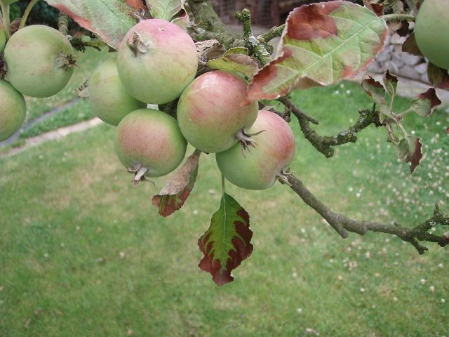 Letos mi poprvé začali hnědnout listy na letité jabloni.Trochu to vypadá jako strupovitost ale plody jsou čisté. Prosím o radu co by to mohlo být. Připojený obrázek:
