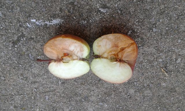 Asi by bylo lepší vidět takto poškozený plod in natura, ale i podle fotografie je zřejmé, že prvotně byl plod poškozen žírem obaleče jablečného. / Na fotografii v pravé části plodu/. Druhotně je potom jablko napadeno některou houbou / nesprávně plísní /. Jablka, poškozená obaleči, bez stopky, s poškozenou slupkou se nedají skladovat. Místo poškození je vstupní bránou pro tyto patogeny. Poškozené plody obaleči často hnijí již na stromě, kdy většinou bývají napadeny houbou Monilia fructigena. A na podzim loňského roku způsoboval zejména obaleč jablečný na neošetřovaných stromech nevídané škody. |