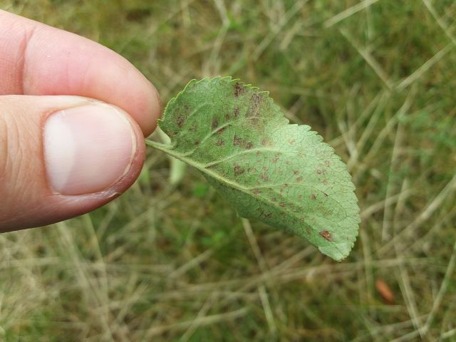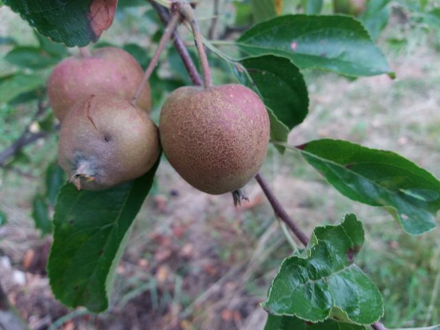 Na listech nejspíše strupovitost, na plůdcích nahoře (první snímek) buď padlí nebo reakce na ošetření sírou /?/, ty propadlé skvrnky by mohly být od strupovitosti, ale i od fyziologického nedostatku vápníku, dík celkově horšímu stavu stromku (barevné skvrny na listech, opadávající listy), popřípadě od malých krup. Docela dobré je napsat o jakou odrůdu jde. Jestli jsou snímky plůdků aktuální (konec července), pak nemají ani vhodného opylovače. |
