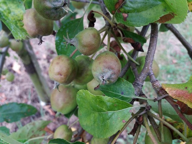 Pokračuje to bohužel dál... Jablíčka přestali přirůstat. Listů hnědych přibylo. A jak je vidět prasklina na jablku začla se zvětšovat a ma půl 1cm a začli praskat i ostatní. |