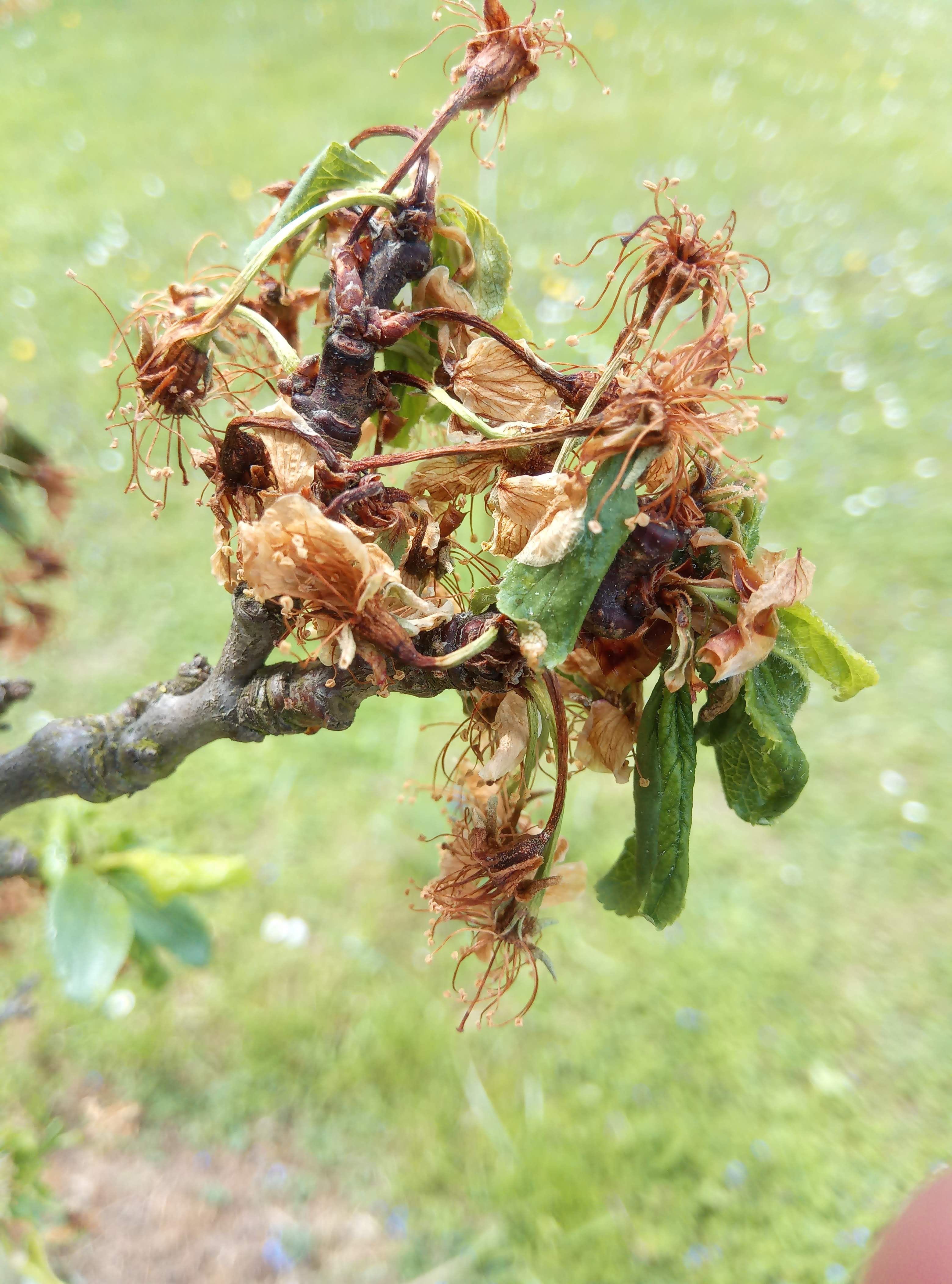 Vzhledem k tomu, že listy v okolí nevypadají, že by byly poškozené mrazem, bude to nejspíše monilie. Do rostliny se dostává skrze květní orgány. Snad krom broskvoní už se objevuje na všech peckovinách. |
