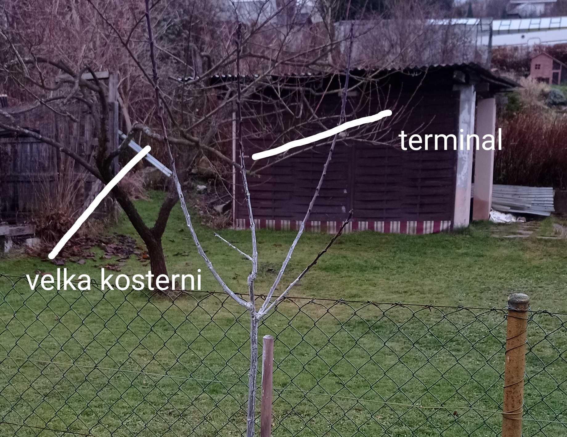 Matůš, omlouvám se, ale upravit graficky fotky zatím neumím-možná už to ani nestihnu, čas se mi krátí-3,2,1,0.................Trocha humoru .Fixaci-odklon výhonu lze udělat i pomocí těžítka-např.malou pet lahví naplněnou trochou vody a zavěšenou na konkrétním proutku, nebo i rozpěrkou mezi stávajícím kolíkem a prutem, nebo prkénkem mezi terminálem a prutem vlevo, nebo klacíkem současně odklánějícím dva postranní výhony, který je přichycen ke kůlu či terminálu atd. Současný terminál by v takovém případě dostal víc energie-živiny začátkem vegetace při pučení a následném výparu z listové plochy letí nejvíce směrem nahoru, do stran méně. Řešit se to dá i bez momentálního terminálu-dočasně, vhodné, nové, bujné, svěží, perspektivní se téměř jistě zjeví v místech blízkých střede stromku a Vy si pak-v případě většího počtu vyberete nejvhodnější z nich. Je možné, že ten terminál mešká, protože má nějaký na fotce neviditelný problém-nekrotizující čípek-místo po předchozím řezu-střihu, nebo zarostlý úvazek-špagátik, drátek...? |