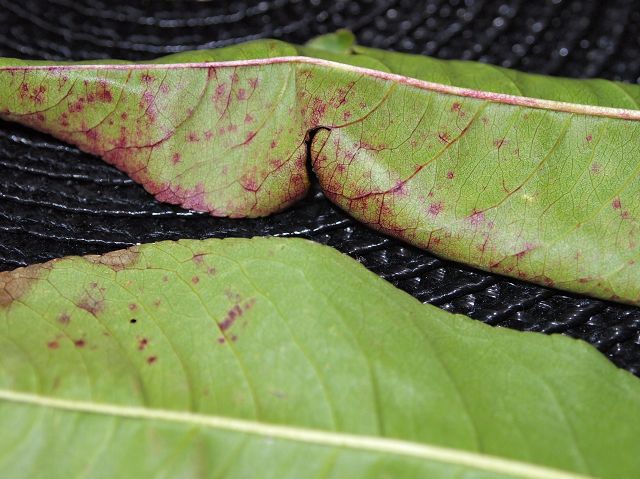 Hezký den, mohlo by jít o počáteční stadium choroby suchá skvrnitost listů broskvoně. Ošetřuje se proti ní po opadu listů a v předjarním období měďnatými preparáty, od rašení, v době vegetace přípravky Dithane (kontaktní), Talent (lokálně systémový), Horizon (systémový). |