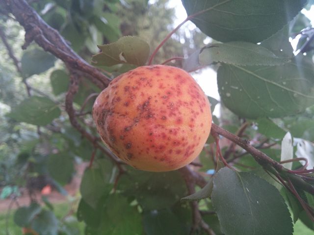 V pravé polovině plodu to vypadá na rozvinutou strupovitost peckovin, vlevo na začínající, ale mohla by to být v místech, kde zůstane jen oranžový flíček bez následného hnědnutí i odrůdová reakce na sluneční záření, teplo. |