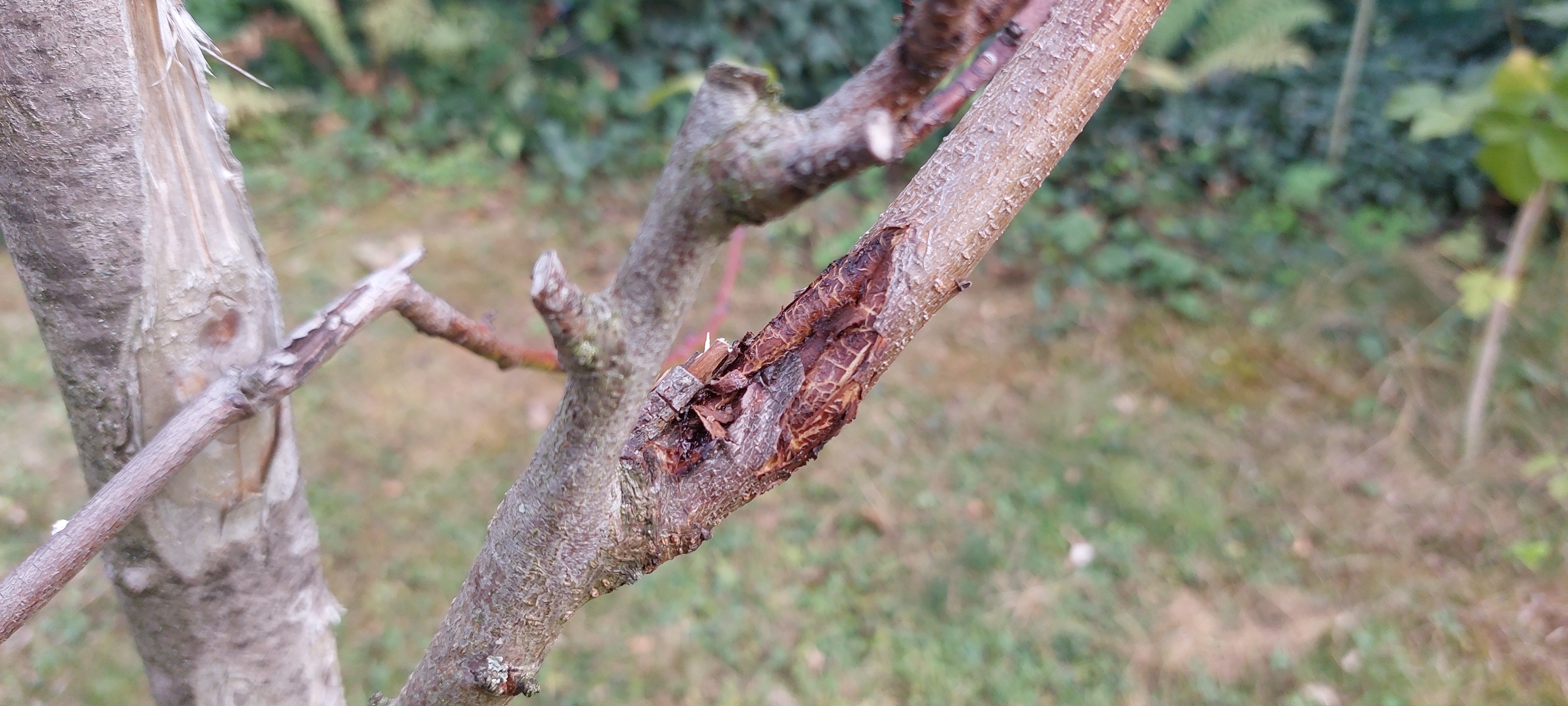 Zahojená rána z loňska. Možná po kroupě, možná byla v místě špatně zastřihnutá větvička. Tam co je něco jako kapka klejotoku. Ale já bych viděl horší věci okolo. Proč nedáte celkovější pohled? |