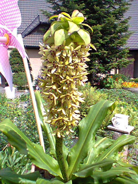 Jedná se o cibulovinu z čeledi amarylkovitých chocholatici /Eucomis/ pocházející z Jižní Afriky. V teplejších oblastech naší republiky údajně přezimuje i venku při zajištění zimní přikrývky, jinak je lépe nechat na podzim zatáhnout a přezimovat v suchu a nižší teplotě. |