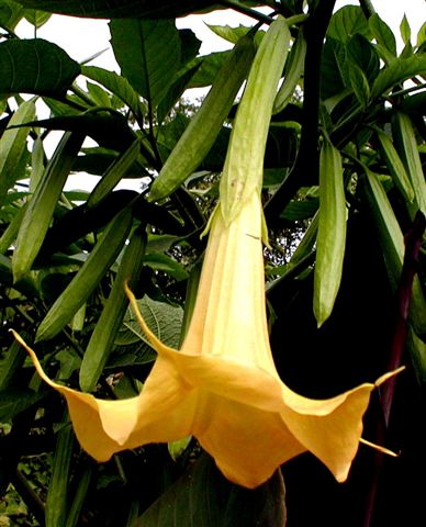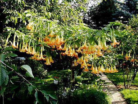 Mohutné rostliny brugmansií vypěstované v zahradní půdě. Připojený obrázek: