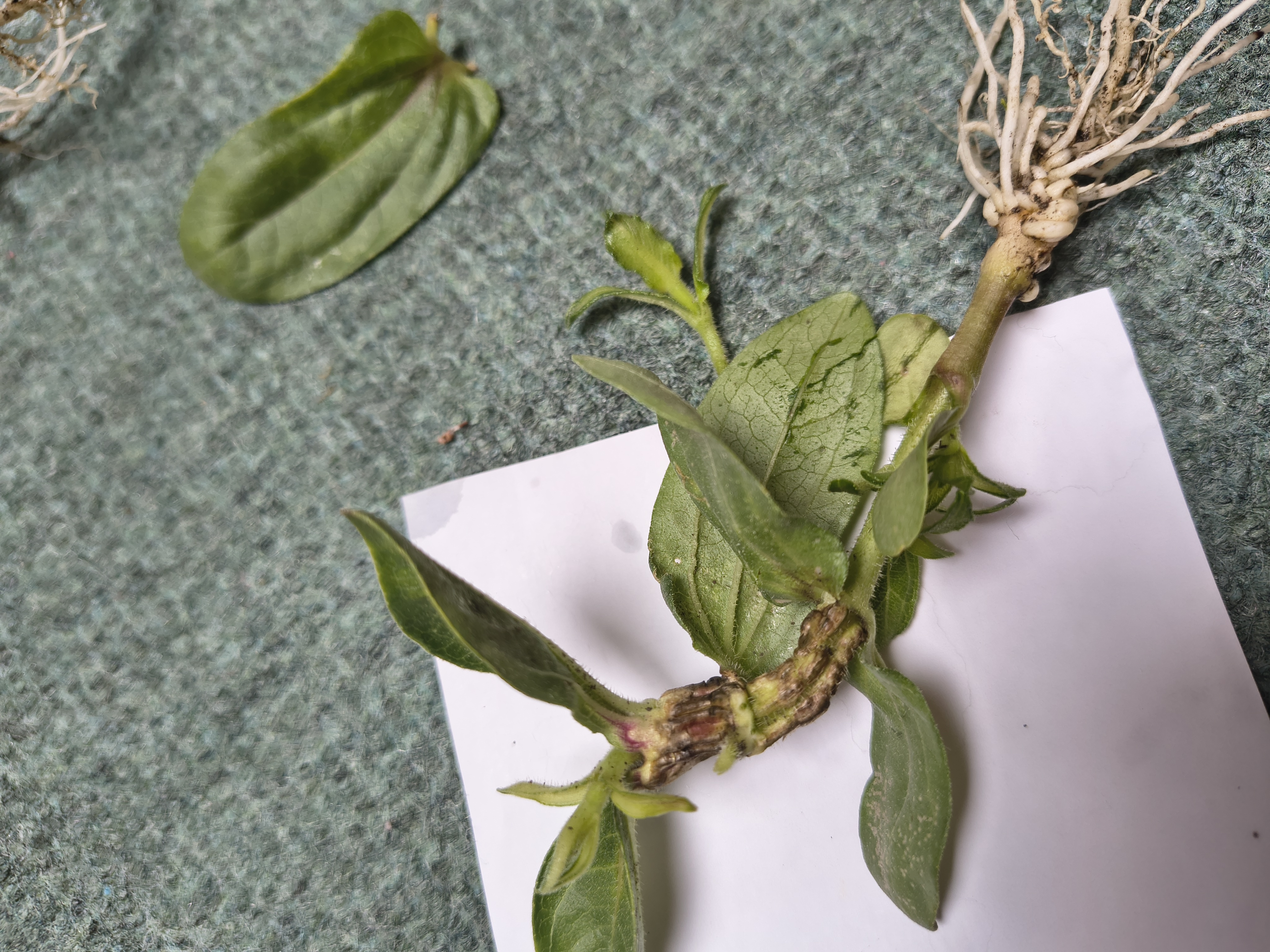 Vršek se kroutí, u kořenů jsou nějaké drobné hlízy a stonek je také zdeformovaný - vrásčitý a místo zelené barvy je hnědý - připomíná spíše kůru než stvol rostlinky.