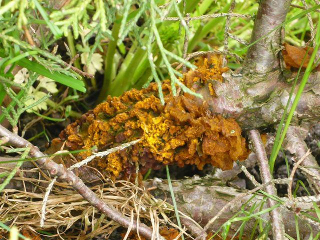 Nejedná se o thuji ale o jalovec a jde o rzivost hrušně. Je to dvoubytná rez a jejím druhým zimním hostitelem jsou právě četné druhy okrasných jalovců. Právě vycházející časopis Zahrádkář obsahuje podrobný článek od rostlinolékaře Petra Ackermanna, kde je vše včetně ochrany dobře popsáno. Další informace najdete v naší metodice http://www.czsos.cz/metodiky/ http://www.czsos.cz/metodiky/O_D00451.HTM |