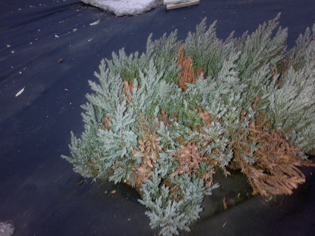 Jalovce jsou obecně odolné suchu, přísušku. Ale musejí mít vytvořený dostatečně objemný kořenový systém a to trvá nějakou dobu. Některé druhy a odrůdy se hůře vyrovnávají s vysokými teplotami a výrazným suchem, navíc právě na těchto stříbrných či modrých bývá poškození častější (v tomto případě nejspíše Juniperus squamata, ještě na černé textilii, pod kterou je horko, které nesvědčí tvorbě a rozrůstání kořenového systému). Zbavte jalovec suchých částí, ještě jednou se podívejte na kmínek s větvičky, jestli na nich nenajdete třeba puklici. Textilii bych pokryl nějakým materiálem, který omezí její zahřívání, omezí výpar vody přes tuto textilii. Ne všechny jalovce jsou náchylné k napadení rzí hrušňovou. Ale pokud nechcete hledat v literatuře, které jí trpí, ošetřete své jalovce v srpnu a v září příštího roku některým z doporučených přípravků /v Zahrádkáři č.11,12-2013 a v č.1-2014 vychází postupně knihovnička Ochrana rostlin, kde je vedle stovek dalších chorob, škůdců a přípravků proti nim použitelných najdete/. Prohlédněte keříky i na jaře, pokud je rez v zahradě, může už na citlivých druzích a odrůdách být po prvním roce v takové zahradě "zahnízděná". |
