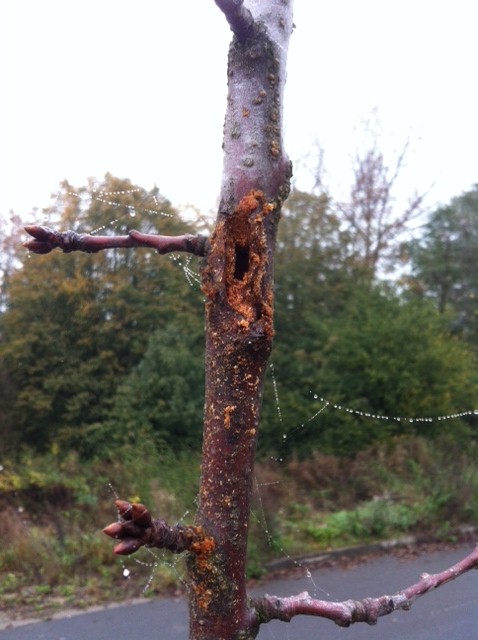 To vypadá na napadení drvopleněm. Přikládám něco z jeho biologie: poměrně běžný motýl, jehož housenky najdeme v ovocných i okrasných stromech. Housenky vyžírají hluboké chodby, které bývají zakončeny otvory z kterých vytlačují "piliny". Pokud je napadení stromu velké, nebo se jedná o stromy, které jsou nějak oslabené, může způsobit jeho úhyn. |