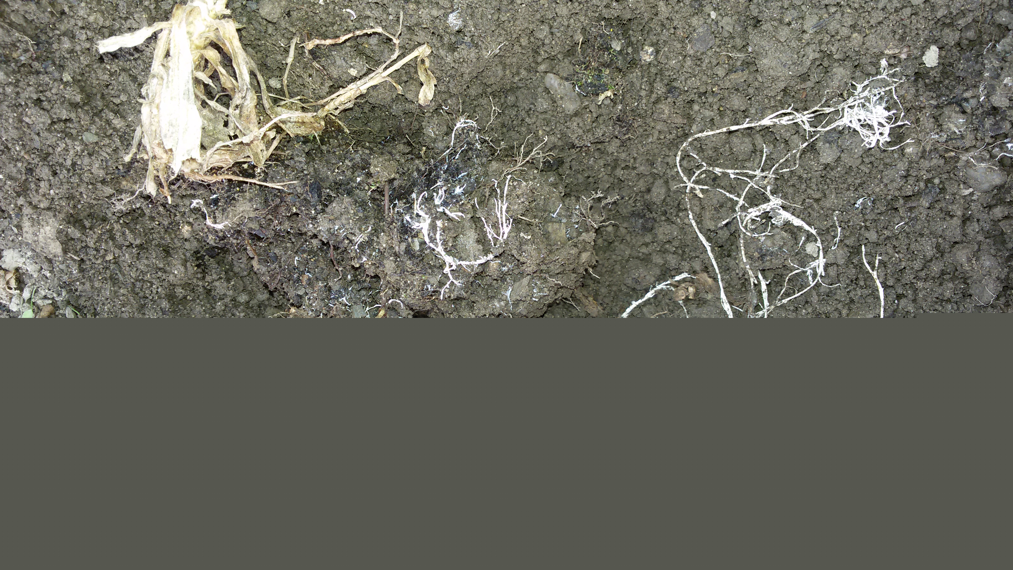 Připojený obrázek: Vlákna v zemině - dřevokazná houba?