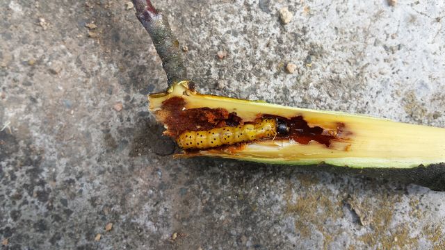 Dobrý den.Dnes jsem na jabloni objevil tohoto škůdce.Vyžírá dřevní hmotu větve a zbude pouze obal z kůry. Připojený obrázek:
