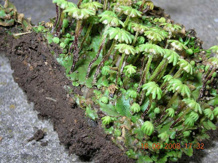 Nejspíše to patří mezi jatrovky. Zacházet by se s tím mělo nejspíše jako s mechem, i když je to botanicky výše. Obyčejně rostou na stinných, vlhkých místech, v půdě jí nevadí vápník, roste i na vlhkých zdech,..., na východní a severní straně budov, i u sklepů ve stráních,... Asi to zlikviduje Mechstop (zelená skalice), ale lepší by bylo to shrabat, trávník přihnojit dusíkem, držet ho nízký, stromy nad takovým místem držet spíše ve tvaru čk, pk, půdu kypřit, aby byla navrch oschlá. To teď asi moc nejde, jsou oblasti, kde prší denně a kypřit se nedá, ale je třeba to po deštích zkusit. |
