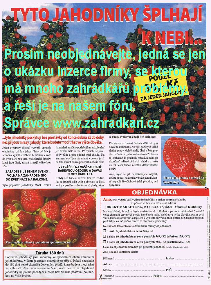 Jsme jedni z těch,kteří věřili ve slušné firmy.Uvedené popínavé jahody máme sazené od počátku března a jediným výsledkem je nárust asi 5.listů a2.rozmnožovacích šlahounů. Budeme to reklamovat a uvidíme,jak se s tím Direkt Market vypořádá. Z jejich strany to je podle 513/1991 Obchodního zákoníku,§45 klamavá reklama,stejně tak dle Zákona č.634/1992Sb.O ochraně spotřebitele.