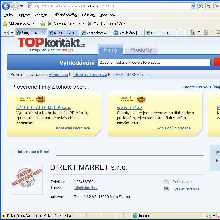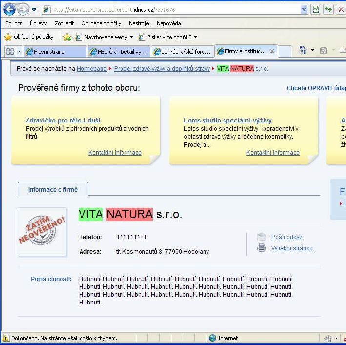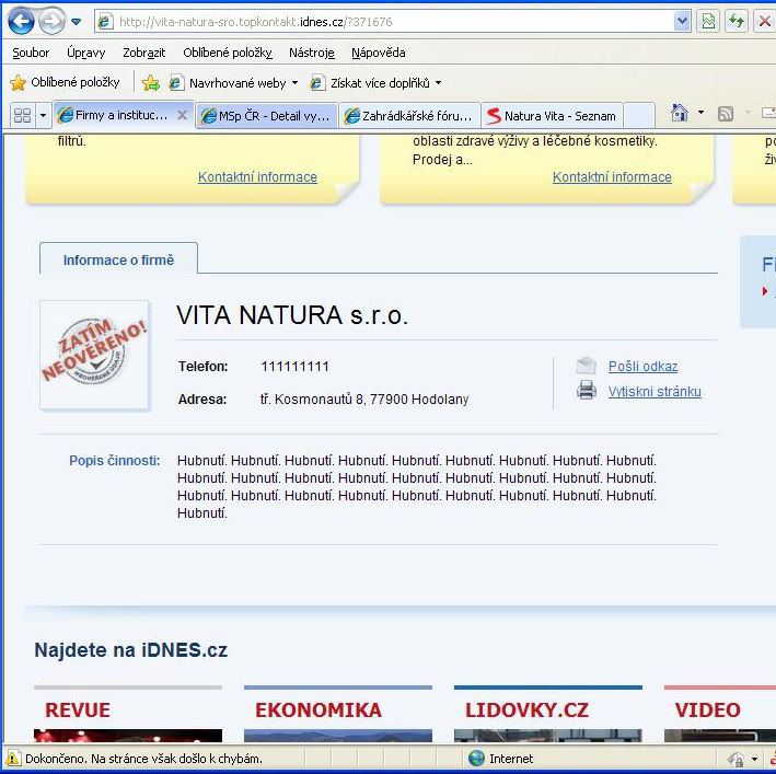 Ať už jde o jahody nebo o zhubnutí, byli jsme podvedeni, firmy se nechaly zanést i do registrů i.dnes, kde však po výzvě na uvedení pevné linky vypsali 123456789 (jak prosté, milý Watsone) a 111111111. (to už nekomentuji vůbec, na prvním čísle Vám aspoň uvedou informace o sjízdnosti silnic. Zkuste si - viz přílohy.)
