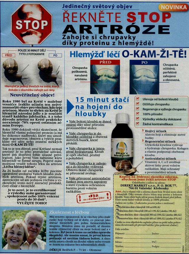 Chtěl jsem také zkusit přípravek z hlemýžďů proti artroze. Naštěstí jsem zadal nejdříve dotaz na internet a nestačil jsem se divit, co tato firma všechno zázračné nabízí. A tyto nabídky jsou uveřejňovány v seriózních (?) novinách na př. 9. srpna celostránková nabídka v Magazinu TV 32/13 str. 2 v Českolipské deníku. Není to klamavá reklama ? Může to být takto uveřejňováno ?