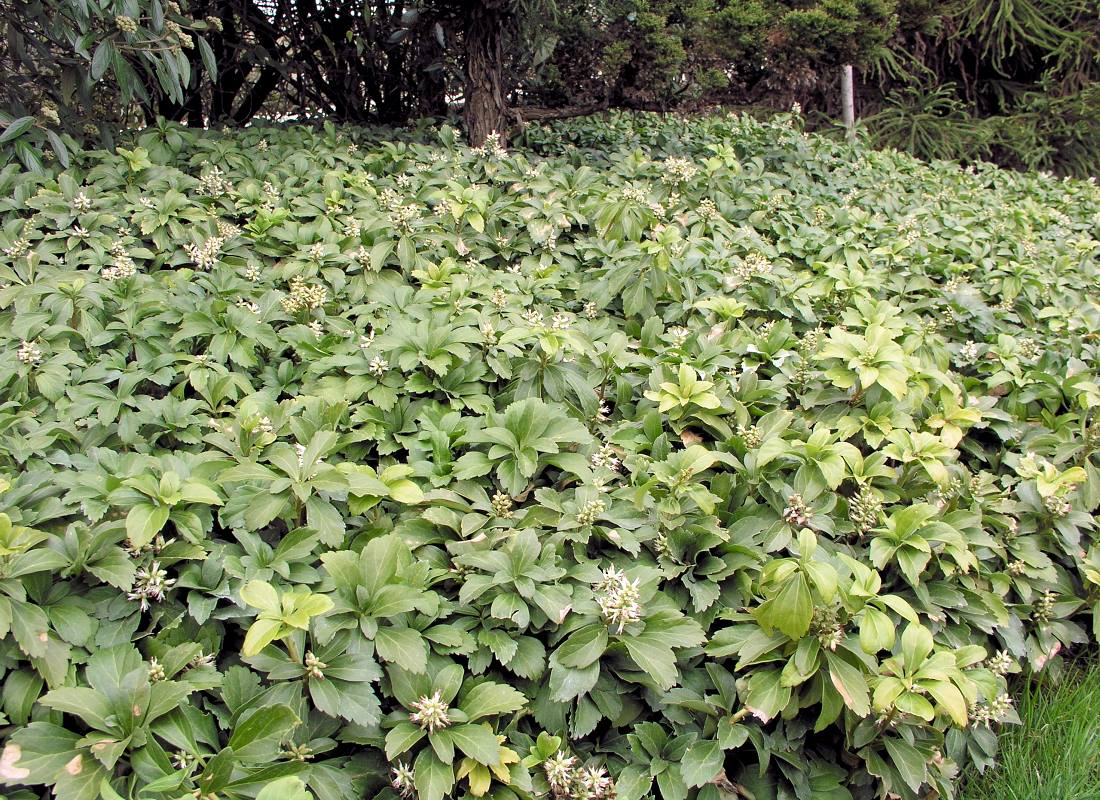 Na vhodném stanovišti bezúdržbově roste také pachysandra (Pachysandra terminalis) původem z Japonska. Stálezelená, dlouhověká trvalka s tmavě zelenými kožovitými listy a krémově bílými květy vytváří porost o výšce okolo 20 cm. Pěstuje se i panašovaná odrůda Variegata. Rostliny milují živné, mírně vlhké půdy, ale starší porosty zvládnou i sucho.